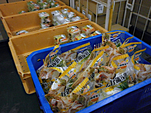 袋に入ったサラダなどを、金属探知機を通りダンボールや専用のコンテナで、近隣の小売店様や遠方の小売店様へ順番に出荷している写真です。